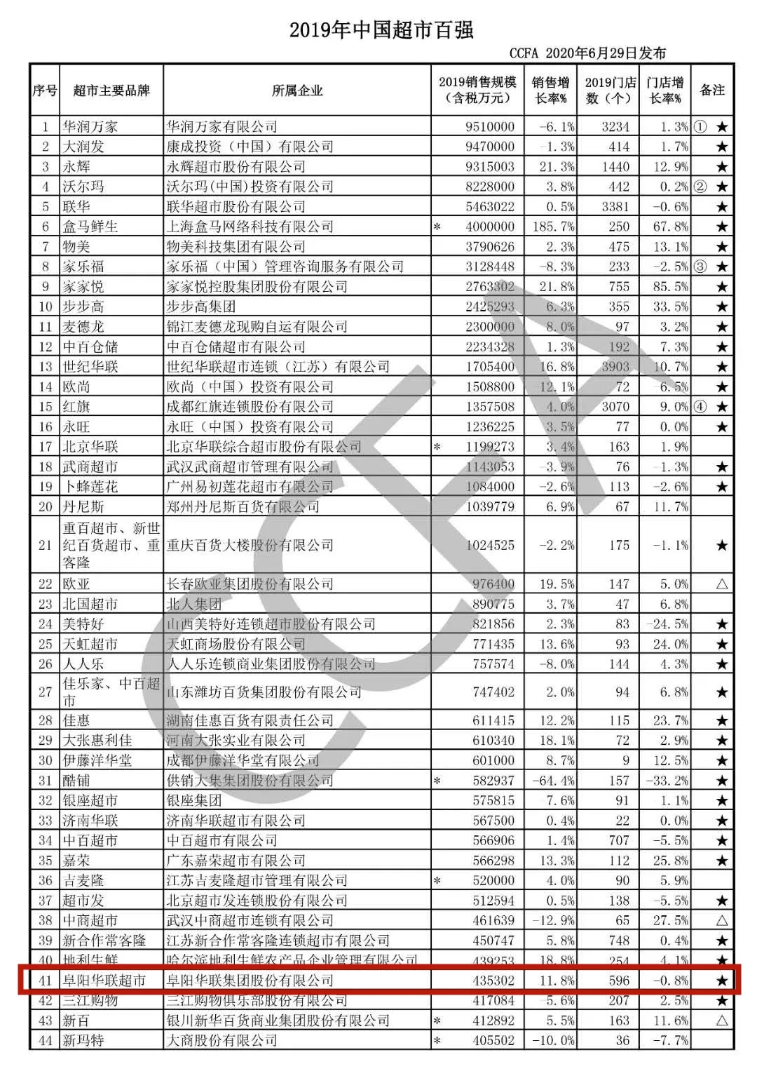2019年中國超市百強出爐 阜陽(yáng)華聯(lián)上升至第41位